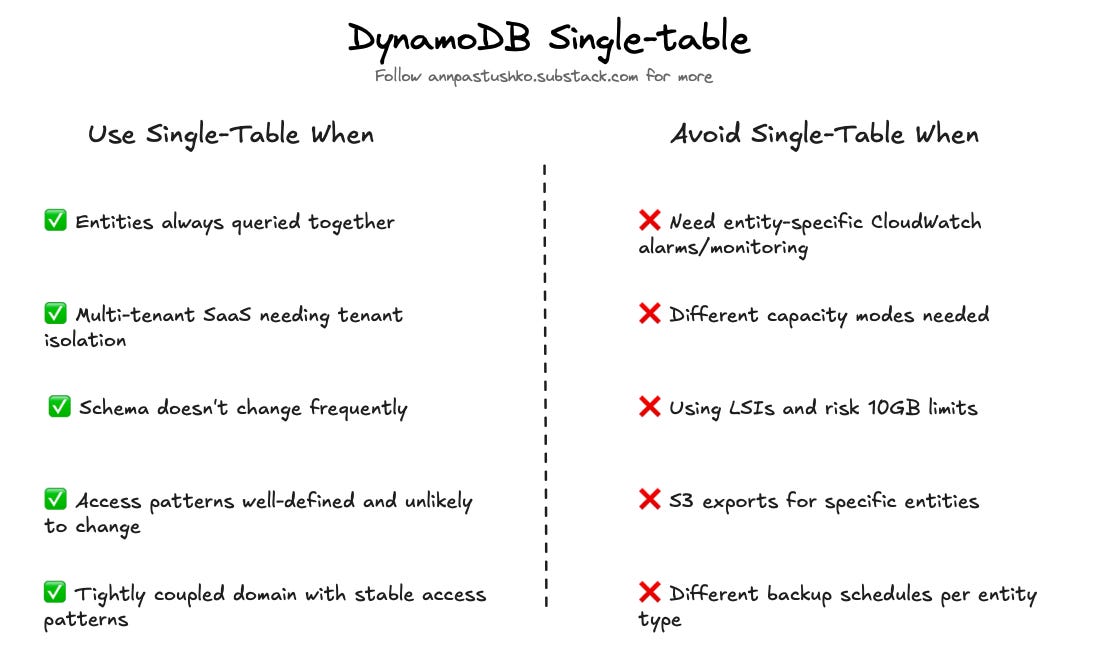 Single-table design works well for tightly coupled domains with stable access patterns. If you’re building a multi-tenant SaaS where tenant isolation is critical, or your entities are always queried together (user + preferences + settings), single-table can be the right choice.