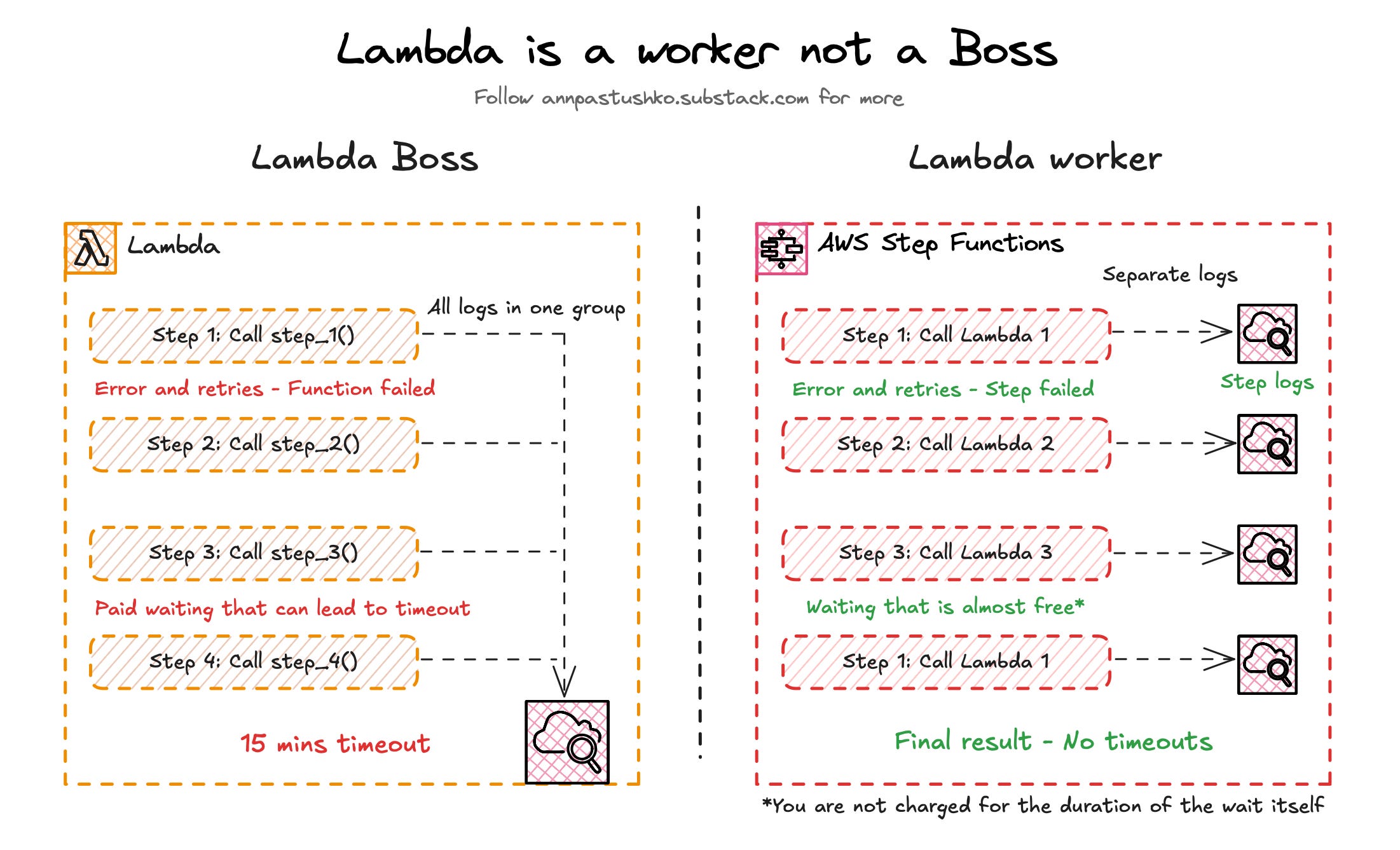 🤓 Does your Lambda function call Service A, check the response, retry with delays if it fails, then call Service B, while writing the current state to DynamoDB after each step? Here’s what’s actually happening: you’ve built an orchestrator inside your Lambda. It looks simple at first — one function, one file, easy to understand. But you’re managing workflow state manually, coding retry logic from scratch, and paying for compute time during every error handling routine. There’s a better way.